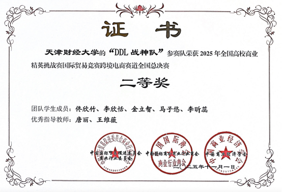 2025年11月10日,全国高校商业精英挑战赛创新创业竞赛(跨境电商赛道)全国总决赛圆满落幕。在我校经济学院师生的共同努力与顽强拼搏下,参赛团队共获得一等奖1项、二等奖1项。这是我院第一次派出学生代表参加该项赛事,赛前指导教师和参加同学对参赛文案和直播视频进行多轮打磨和修改,并邀请企业专家入驻指导,最终取得优异成绩,充分展示了我院“以赛促教、赛教融合”育人机制的卓越成效。