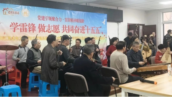 舞台上,社区老年民乐爱好者们手持二胡、扬琴等传统乐器,奏响悠扬的传统曲调,台下居民围坐倾听,现场氛围温馨而热烈。在这精彩演出的背后,我院青年志愿者们承担起幕后保障的重任,协助摆放桌椅、搬放乐器箱、整理乐谱架,用细致周到的服务,为整场活动的顺利开展筑牢基础,彰显了青年志愿者的温情与担当。