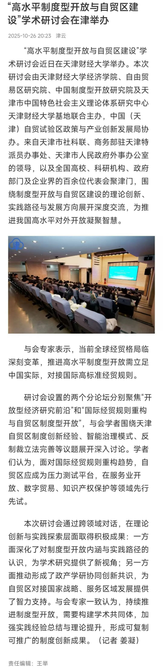 《人民日报》、中国教育新闻网、津云报道“高水平制度性开放与贸易区建设”学术研讨会在我校举办