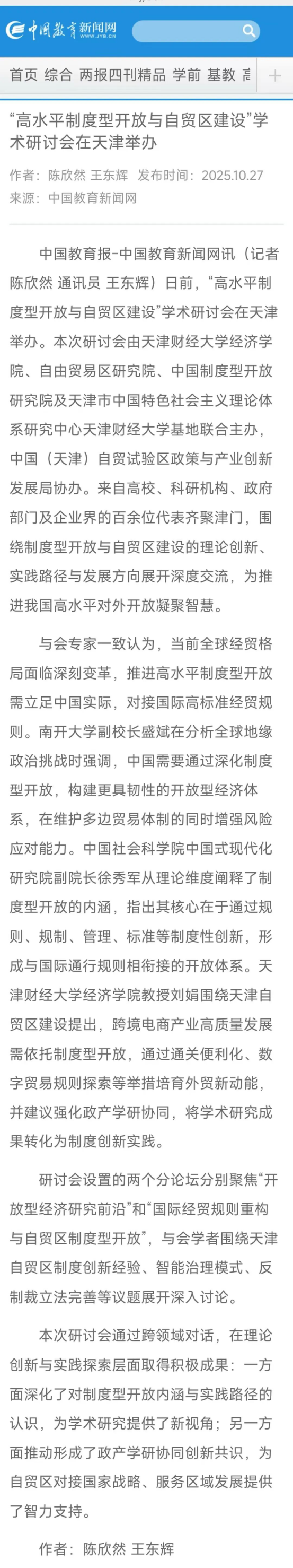 近日,《人民日报》、中国教育新闻网、津云报道“高水平制度性开放与贸易区建设”学术研讨会在我校举办。