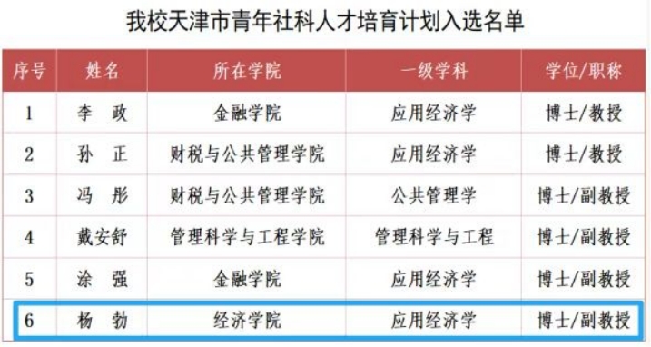 近日,天津市青年社科人才培育计划首批培育对象名单公布,我院杨勃副教授凭借突出学术实力成功入选。