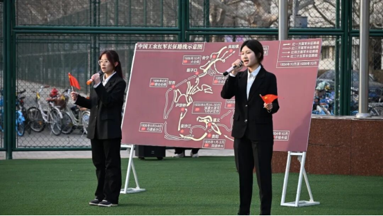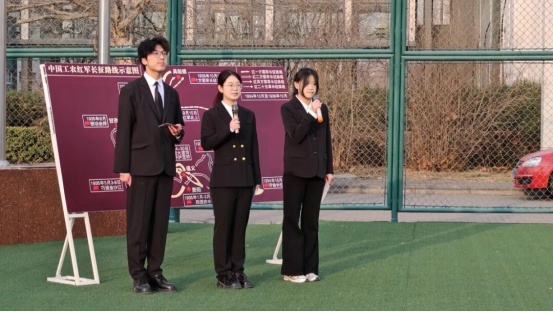 为让同学们更真切地感受那段峥嵘岁月,在“重走长征路”微缩地图沉浸式展示环节,国贸2501班何俊非、国商2502班王怡婷、经济2502班李崇杰三位同学以饱含深情的讲述,带领全场师生穿越时空——湘江血战的烽烟、遵义会议的转折、翻雪山过草地的艰险,一幕幕历史画卷在眼前铺展,直抵人心。那些浴血奋战的瞬间、永不褪色的信仰,在三位同学的朗诵中化作激荡灵魂的力量。