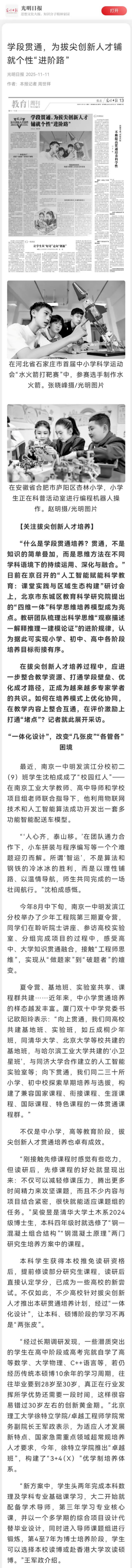 11月11日,《光明日报》报道我校探索学段贯通,为拔尖创新人才铺就个性“进阶路”。