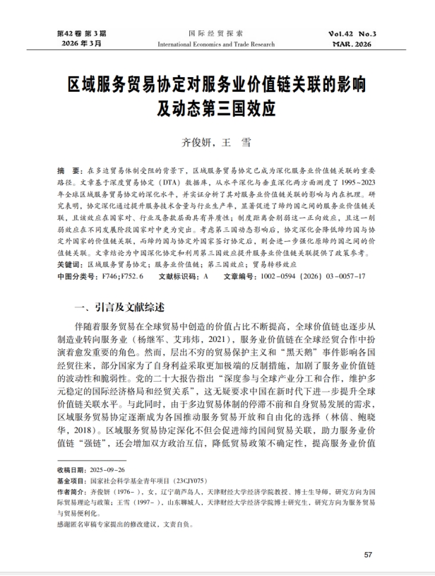 近日,我校经济学院博士生王雪与导师齐俊妍教授在《国际经贸探索》合作发表题为“区域服务贸易协定对服务业价值链关联的影响及动态第三国效应”的高水平论文。